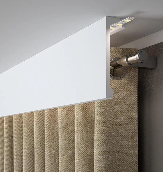 Listwy karniszowe to przede wszystkim oszczędność czasu i obniżenie kosztów remontu. Kształt listew pozwala na umieszczenie w specjalnie zaprojektowanej wnęce taśmy LED, dzięki temu listwa łączy funkcję maskowania karnisza z oświetleniem pomieszczenia.